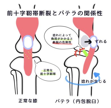 前十字靭帯断裂の主な原因は、外傷もしくは長い時間をかけて進行する靭帯の変性であり、多くの場合は慢性断裂として発症します。特に小型犬では、膝蓋骨脱臼(パテラ)が多い傾向にあり、パテラが背景にあることで前十字靭帯断裂が進行してしまうこともあります。パテラは膝のお皿がずれることによって、大腿骨と脛骨が捻れた状態になってしまいます。この状態のまま放置していると、前十字靭帯に負荷がかかり、いずれ断裂してしまい、歩行に問題が出たり歩けなくなってしまったりします。