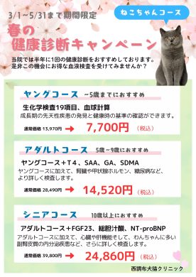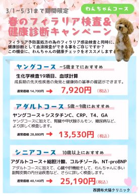 わんちゃんはフィラリア検査➕血液検査、ねこちゃんは血液検査が通常よりもお安いお値段でできるキャンペーンとなっております。
