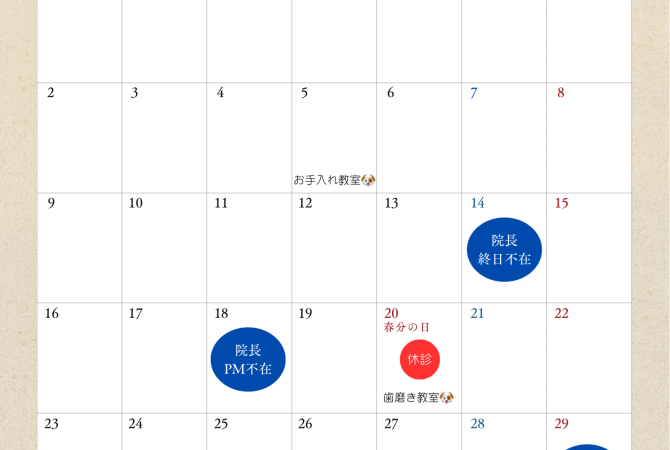 2026.2.26 お知らせ 3月の診療日のお知らせ🐾 詳しく見る 2026.2.19 お知らせ 『わんちゃんねこちゃんのお悩み相談室 』はじめました🐶😺 詳しく見る 2026.2.2 お知らせ 2月の歯磨き教室🦷 詳しく見る 2026.1.29 お知らせ診療日 2月の診療日のお知らせ 詳しく見る 2026.1.12 お知らせ 1.2月 歯石除去キャンペーンのお知らせ🦷 詳しく見る 2026.1.3 お知らせ 1月の歯磨き教室のお知らせ🦷🪥 詳しく見る 2026.1.1 お知らせ診療日 1月の診療日のお知らせ🎍 詳しく見る 2025.12.1 お知らせ 12月の診療日のお知らせ 詳しく見る 2025.11.19 お知らせ 12月の歯磨き教室のお知らせ🦷🪥 詳しく見る 2025.10.16 お知らせ 🎖️長寿表彰が始まります!🐶🐱 詳しく見る 2025.10.1 お知らせ 10月の診療日のお知らせ 詳しく見る 2025.9.9 お知らせ 定休日変更のお知らせ 詳しく見る 1 / 33 ページ23…33次へ »